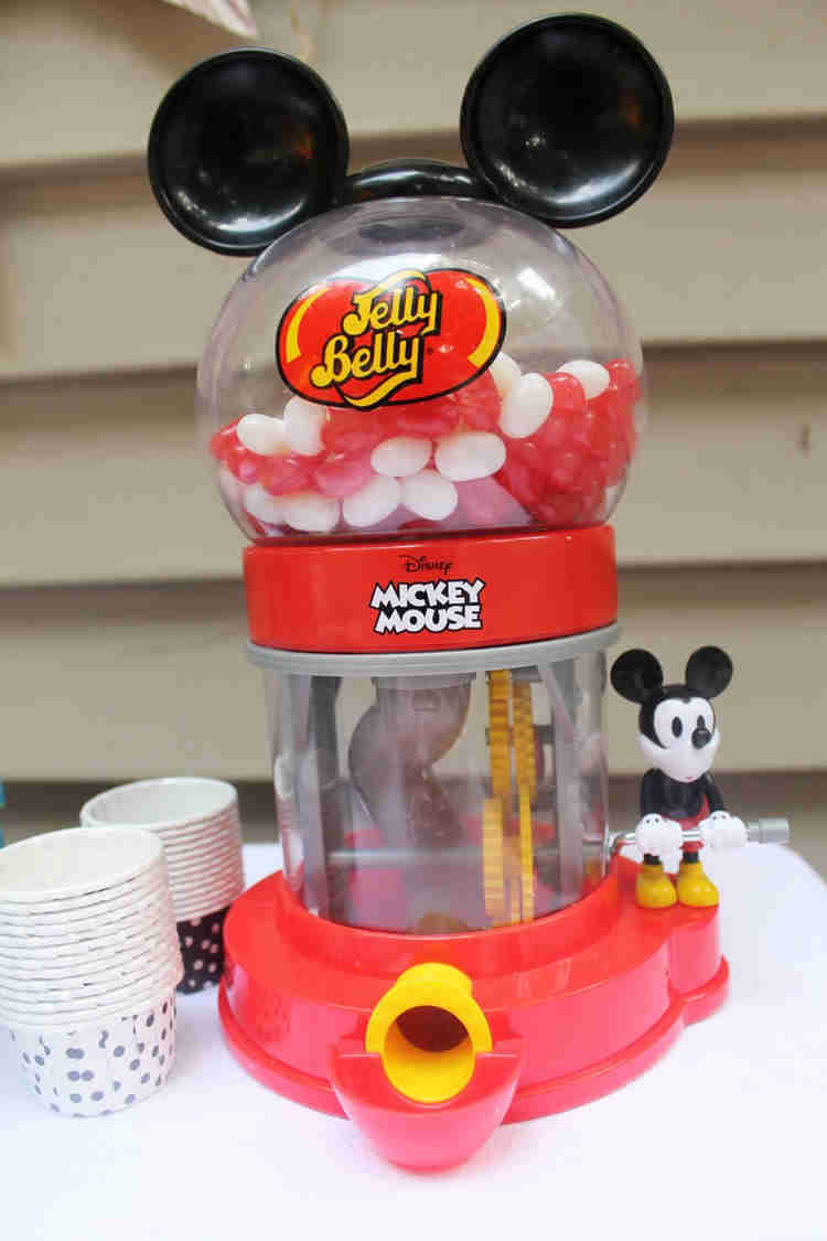 Some other favorite little details is this cute Disneyland hat with his name embroidered on it that he wore in his 2 year pictures I took, and these adorable felt Mickey balls that I strung on clear wire! We also had a hot diggity dog bar with lots of food! That table included this awesome Jelly Belly Mickey dispenser that I found at Marshall's on clearance, talk about a score!